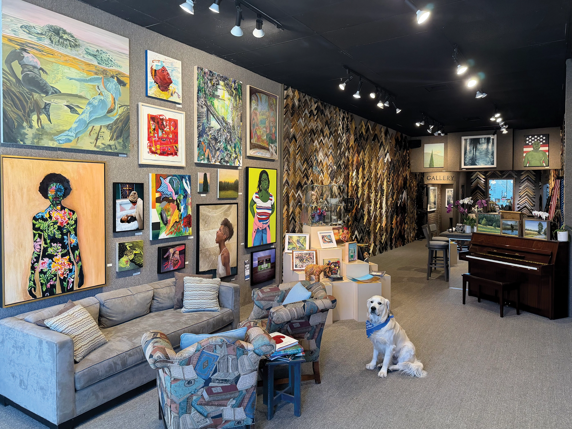 ABOVE: Craven Allen Gallery’s main space, with its original brick walls and warm, intimate lighting, feels unpretentious and welcoming. Sixteen-month-old Jasper is the official gallery dog and a highlight of every visit. Part of an eclectic district that once served Watts Hospital and now the NC School of Science and Math, the gallery is just next door to the iconic Green Room pool hall, made famous in Bull Durham. Photos courtesy of Craven Allen Gallery.