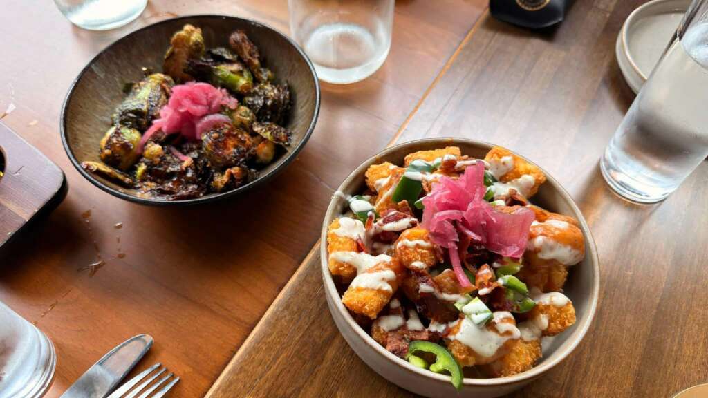 Our third stop brought us to Flying Bull Beer Company, which included a small twist—a cocktail sample alongside the beers. This lineup included a Scotch ale, a West Coast IPA, a Czech-style pilsner, and a cocktail called the Curious Journey, made with gin, rosemary fig simple syrup, and lemon juice. It probably didn’t hurt that we paired the drinks with loaded tots and roasted Brussels sprouts, which were easily some of the best bites of the afternoon.