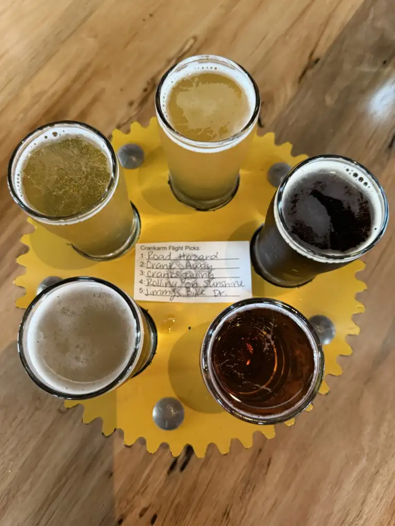 From there, we made the short walk over to Crank Arm Brewing. Our group was greeted with a flight presentation served on a board designed like bicycle spokes—very on-brand for a brewery built around cycling culture.