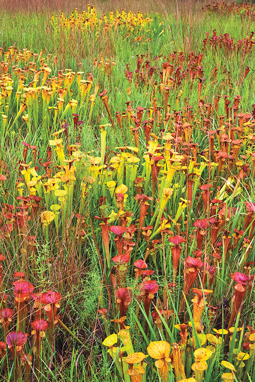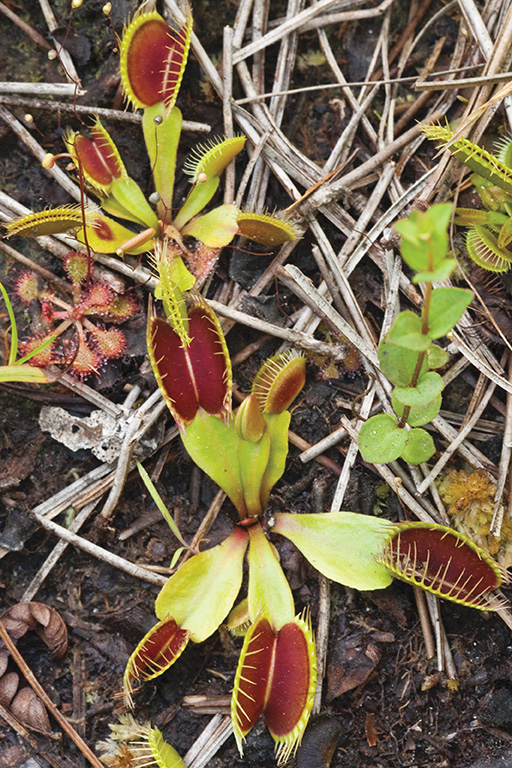 Bays’ water depths, sand rims and peat mats nurture botanical stars … water lilies, sedges, red bay, sweet bay, butterworts, sundews, gallberry, white- and yellow-fringed and rosebud orchids, and the rare Wells’ pixie moss. You’ll find the Venus flytrap, which Charles Darwin called “the most wonderful plant on Earth” in Carolina bays—and pine flatlands within a 90-mile tract from Horry County to Wilmington. Duped insects provide what barren soils cannot—sustenance. (The U.S. Fish and Wildlife Service is evaluating whether the Venus flytrap merits threatened or endangered status, which would provide federal protection under the Endangered Species Act.)