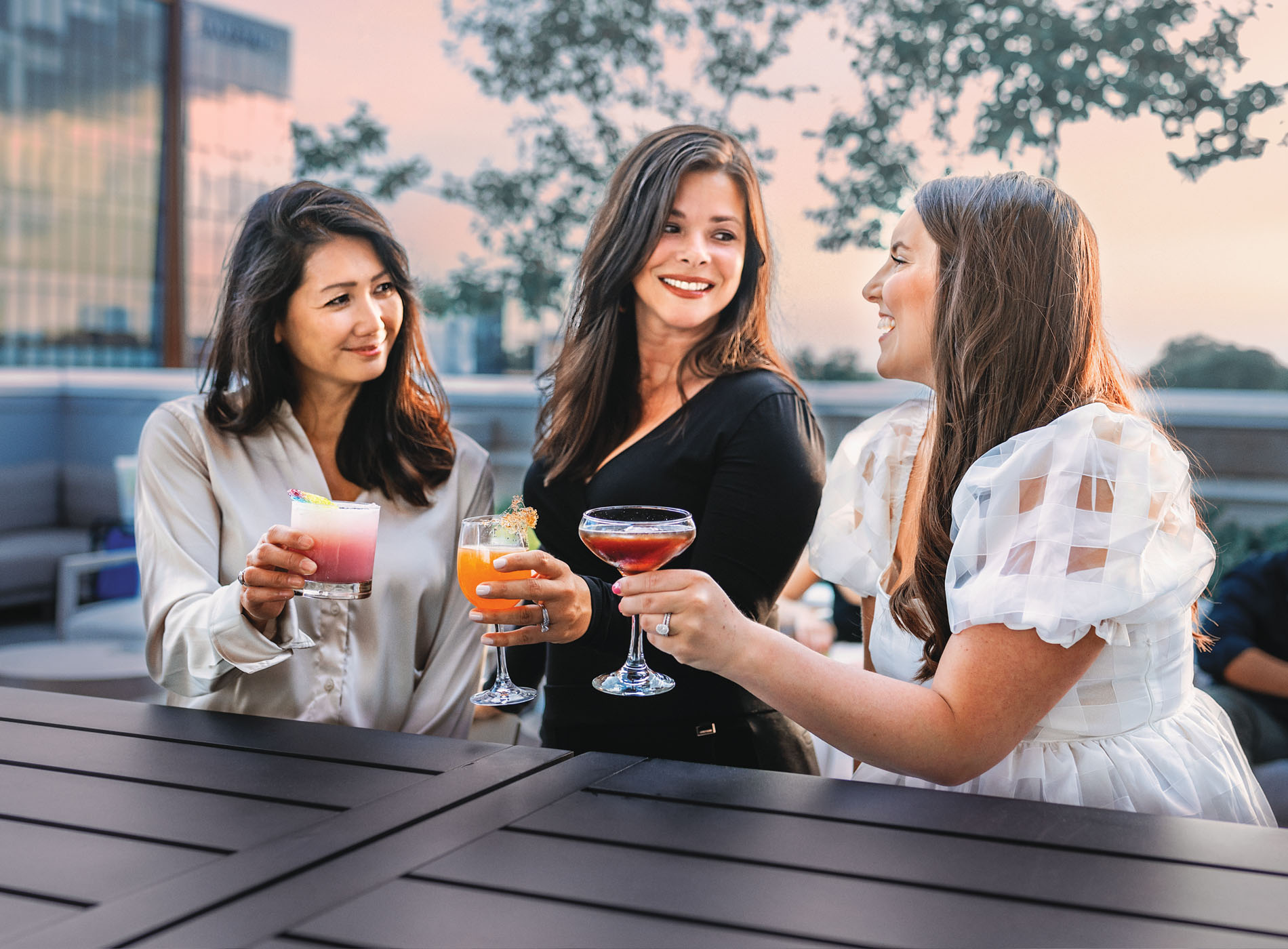TOP OF PAGE: Melissa and Jason Wistehuff, Jason and Nancy Anderson, and Rae and Austin Hackney gather at The Willard Rooftop Lounge to enjoy celestial cocktails and views of the constellations.