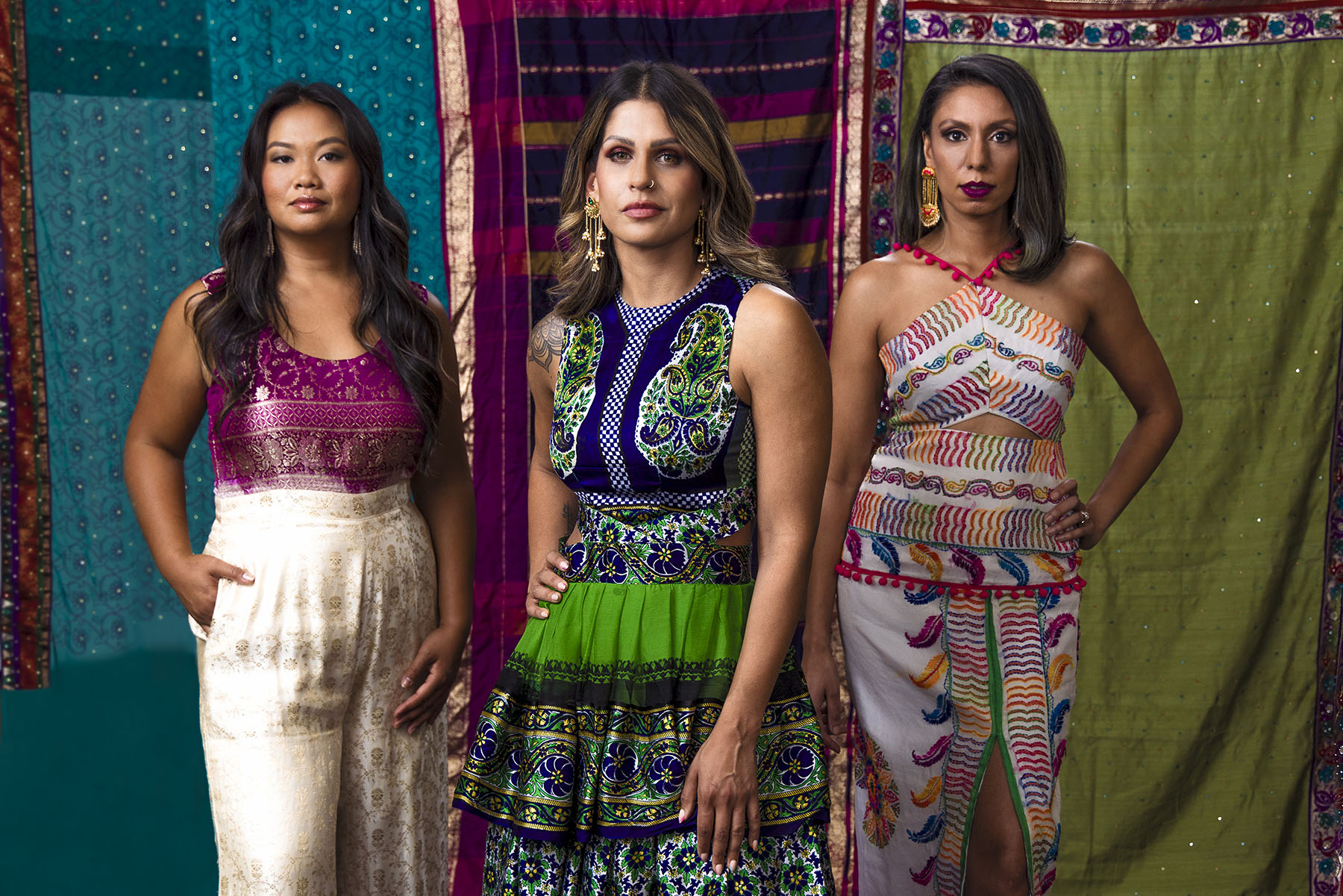 ABOVE: Sheetal Patel (left) is wearing the ‘Sarina’ —a midi dress with a cutout at the waist. It was made from a multicolor embroidered dupatta, a traditional Indian garment similar to a shawl. Julkee Fashion’s owner and designer, Julie Patel (center), is wearing a ruffle dress made from her mother’s sari, which was also the first sari Patel ever wore as a teenager. This is the type of outfit Julkee Fashions designs from heirlooms people wish to preserve in consultation with clients. Anousone Turner (right) is wearingJulkee’s best-selling wide-leg jumpsuit, the ‘Amina,’ made from a cream and dark magenta silk sari.
