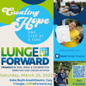 Take part in the Triangle LUNGe Forward 5K, Run, Walk & Celebration. It will be a day of celebration and remembrance, as well as a day to take action and provide hope to those impacted by lung cancer. Your support will make an impact in the fight against lung cancer. Register online.