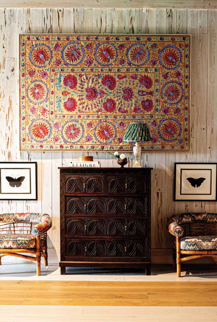 The understated, unfussy interiors, filled with European antiques and vintage art, were created by Charleston’s Jenny Keenan Design. Oriental rugs, wingback chairs, and Schumacher’s “Birds Tapestry” wallpaper in the arched hallway leading to the elevator are a salute to the area’s historic homes.