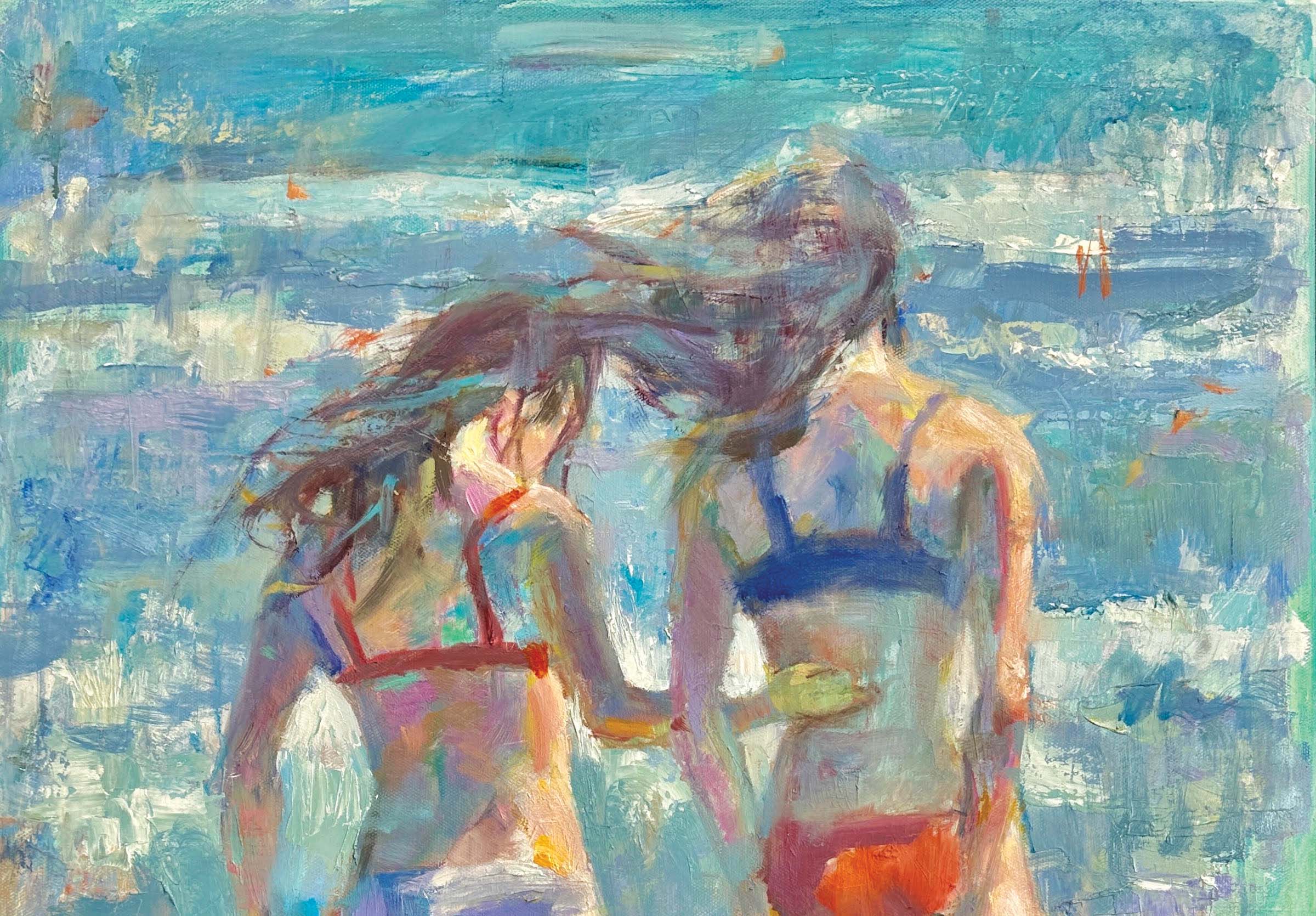 Her technical approach lends an impressionistic quality and a sense of movement for which she is well known. Kennedy brings her scenes to life by painting while the oil paint is still wet. This technique allows her to work with a limited color palette of six or seven colors, blending them into new hues. For Summer BFF she began with an abstract background that interprets the water and beach, using a palette knife, brush and dripping paint. This foundational layer allows her to build the figures on top while integrating the vibrant background colors into their skin tones. As she gradually constructs the painting, stroke by stroke, the scene begins to come together like magic.