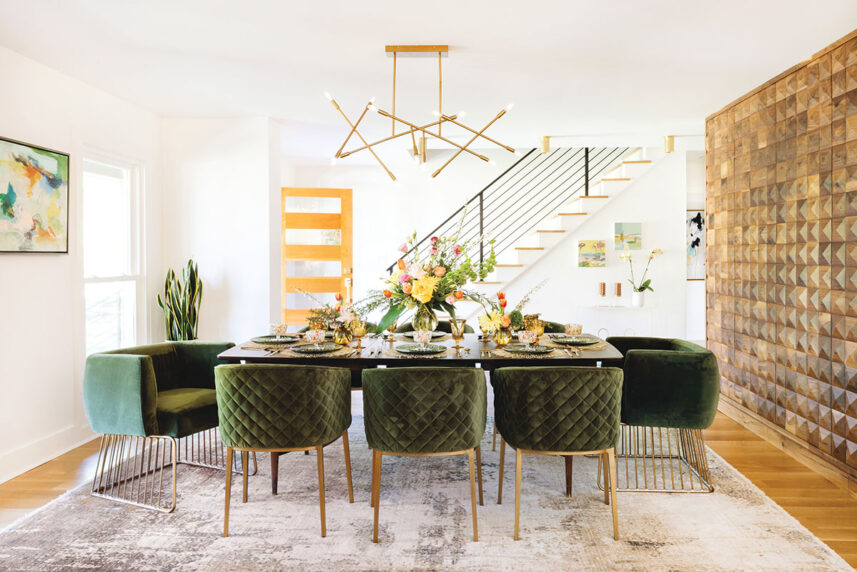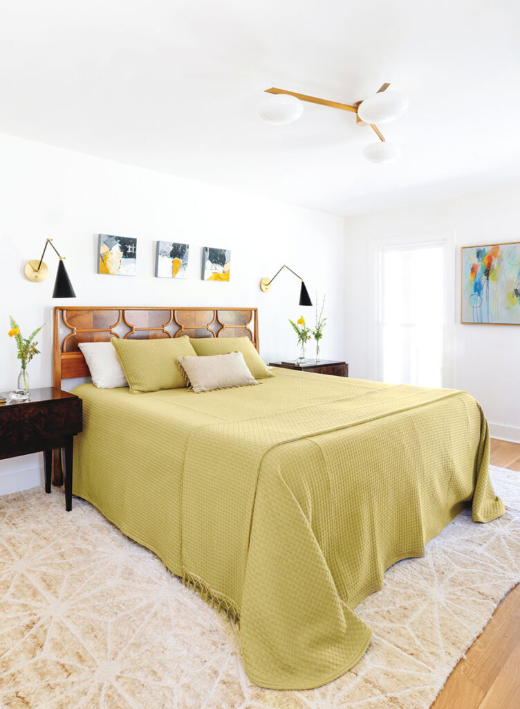 She chose fun MCM pendant lights, chandeliers and sconces—not just for the dining and living rooms, but for the kitchen, the bathrooms, and even the oversized walk-in closet. To add excitement without overwhelming, Nadeau incorporated “moments of color” with select pieces of vibrant-hued furniture and distinctive art. “We wanted unique, original art by local artists,” says Nadeau, who perused Raleigh galleries looking for works with nature-inspired colorways: greens, golds and subtle browns.