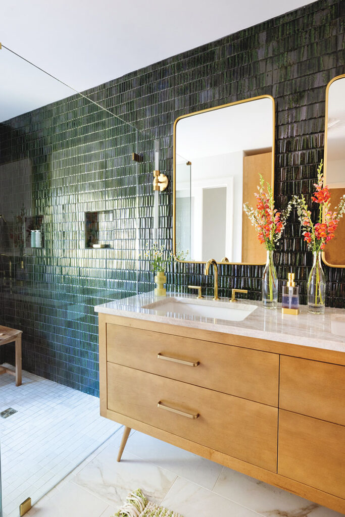 The largest original art pieces are Nadeau’s beloved accent walls. Since bathrooms offer a small, safe place to “go bold,” each one features an accent wall in dramatic Italian tile.