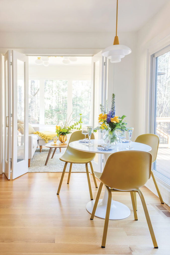 Nadeau also followed the MCM style of “bringing the outdoors inside.” First, to counter the home’s north-facing façade, which limited natural light, she added five exterior windows. The new windows open the home to the property and let the sunshine pour in. Maria says the breakfast nook and adjacent sunroom are especially “happy and light-filled” spots where she drinks her morning coffee and feels at once calm and revitalized.