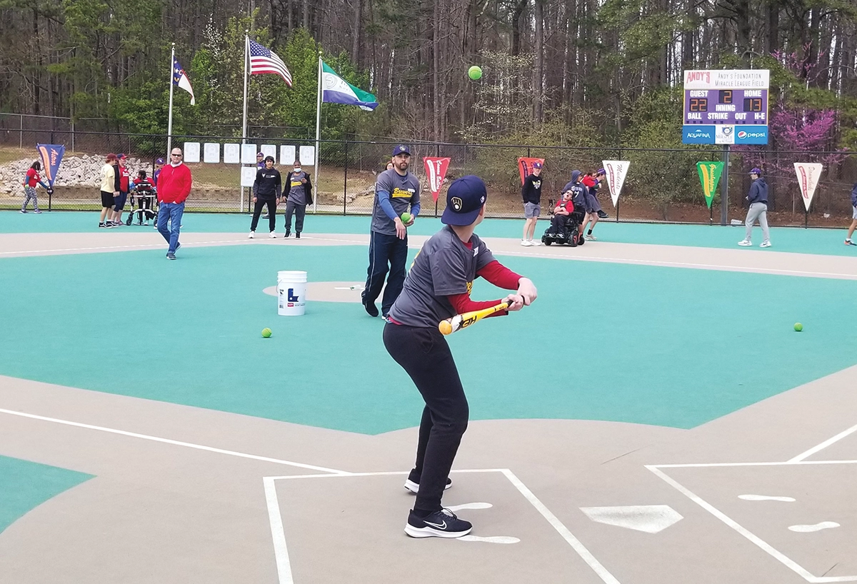 Since its inaugural game in 2006, the Miracle League has grown to include over 600 players across 42 teams at fields in Cary and Durham. Each team has five or six coaches, and the league’s Buddy program pairs players with volunteers, offering one-on-one support. This support can look different depending on the age level: In my son’s elementary school–age group, it’s “controlled chaos,” while in the adult leagues, it’s more about peer-age companionship.