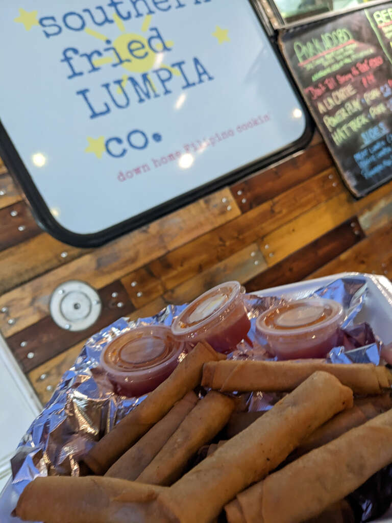 Southern Fried Lumpia A frequent presence at festivals and taprooms around the Triangle, the Southern Fried Lumpia Co. food truck brings Filipino food to the people. While their marquee dish is lumpia, the Filipino’s rendition of egg rolls, the food truck dishes like turon and a beef stew named mechado are difficult to find elsewhere in the Triangle.
