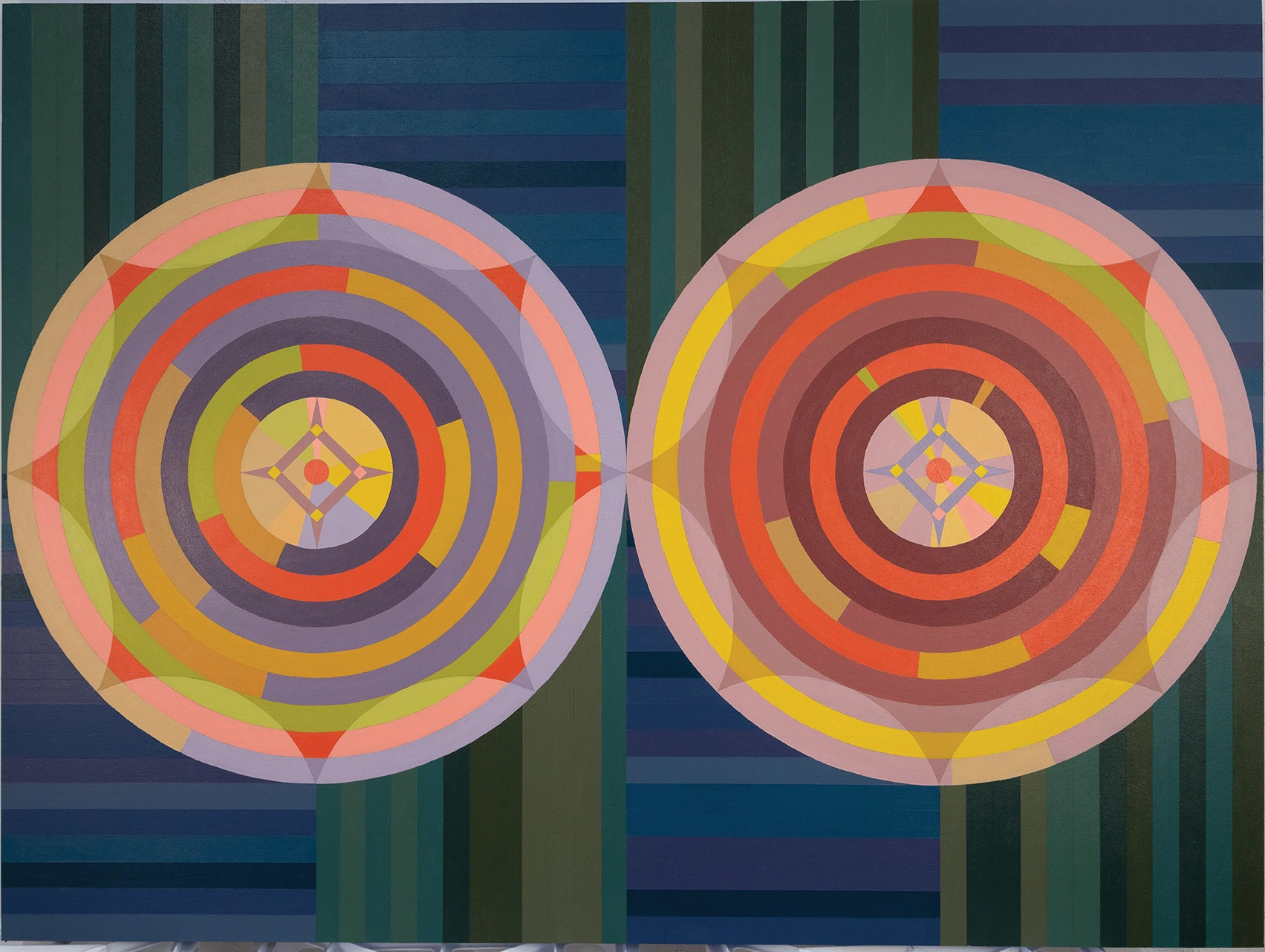 Deuce: Compasses is the first painting in my newest series—a group of six works built around large double circles. Each composition begins with two primary circles, each containing concentric rings inside. When deciding how to position these circles, I wanted them to touch but not overlap. I was thinking about the United States—a country broadly divided into left and right, two sides with very different beliefs that struggle to communicate with one another.